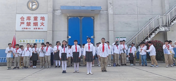 徒步參觀糧倉外圍后,學(xué)生們自發(fā)組織表演了即興節(jié)目,為工作人員佩戴紅領(lǐng)巾,朗朗童音回蕩于大國糧倉,糧庫開放日活動也圓滿落下帷幕。